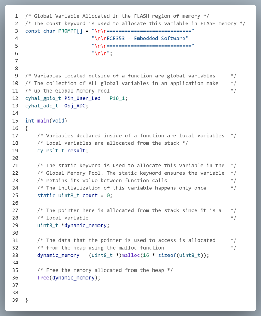 The information we’ve covered about the stack and heap is a high-level overview of two much deeper and more complex topics. In reality, each of these areas could easily span several weeks of coursework. Our goal here is to highlight that microcontrollers have limited memory resources, and the way we write software directly impacts how efficiently those resources are used.