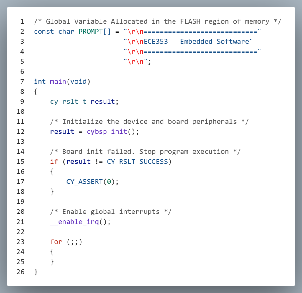 In C, we do this by declaring the variable with the const keyword. For example, the global variable PROMPT below is stored in Flash because it is marked as const. Although it resides in Flash, it is not part of the program instructions—the compiler keeps read-only data separate from executable code.
