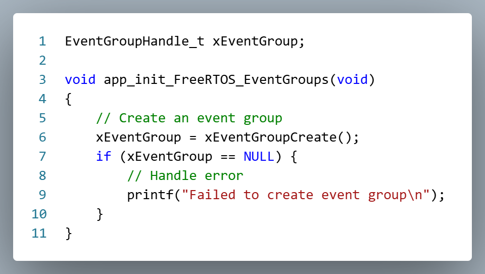 FreeRTOS provides the EventGroupHandle_t type to to access an Event Group. This handle is declared as a global variable which allows multiple tasks to access the same Event Group. An event Group is initialized using the xEventGroupCreate() function.